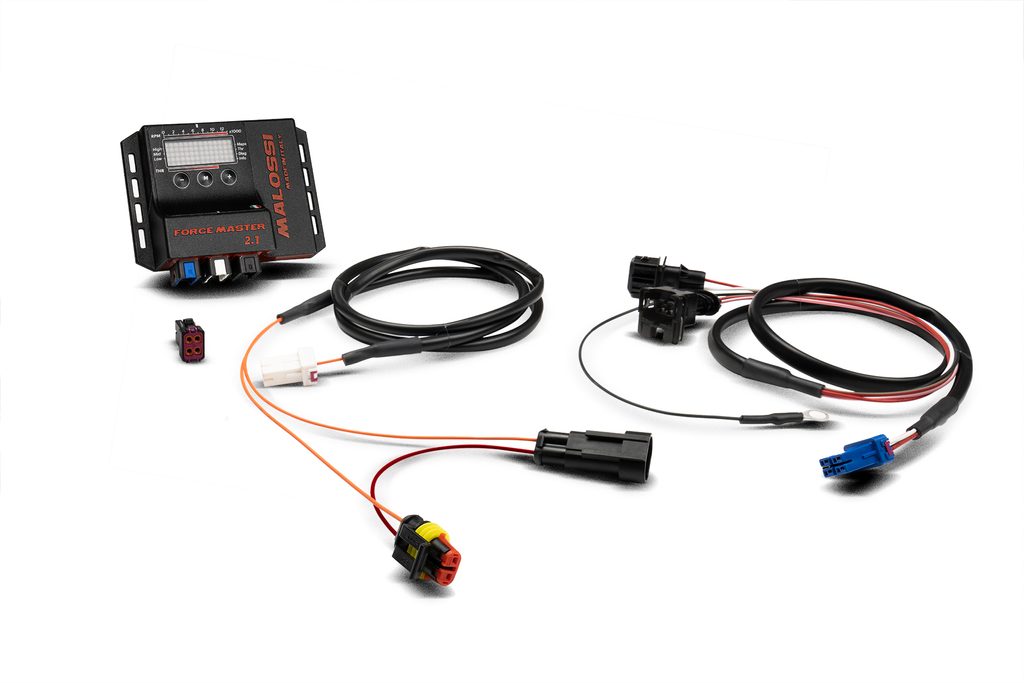 Vďaka úplne novému vzhľadu sa riadiaca jednotka Force Master 2.1 oveľa jednoduchšie konfiguruje. Cieľom spoločnosti Malossi bolo vždy dosiahnuť ergonomickejšie a jednoduchšie používanie produktov: Force Master 2.1 je moderný, adekvátny a super výkonný produkt. Vďaka rozhraniu pre komunikačné linky K a CAN, novému používateľskému rozhraniu a pridaniu kapacitného vstupu zapaľovania je Force Master 2.1 ideálnym doplnkom pre riadenie výkonu vozidla: bez funkčných obmedzení umožňuje posunúť motor za hranicu pôvodného obmedzovača otáčok. Technické detaily Nastavenie karburácie ± 14 % pri min/stred/max Obmedzovač otáčok: + 500 ot./min Teplotný rozsah = -30 °C + 80 °C Minimálne prevádzkové napätie = +7 V Maximálne prevádzkové napätie = +16 V Priemerná spotreba prúdu < -200 mA Ochrana životného prostredia = IP65 2 rôzne mapy: krivka 0: originálny výfukový systém, valec Malossi, originálna hlava, originálny vačkový hriadeľ, originálny filter krivka: výfukový systém Malossi bez tlmiča db, valec Malossi, originálna hlava, originálny vačkový hriadeľ, filter Malossi Plná kontrola karburácie sa dosahuje kombináciou regulátora O2 s riadiacou jednotkou Force Master. Synergia týchto dvoch zariadení nemá žiadne obmedzenia, celá uvedená rovina je riadená, kontrolovaná a optimalizovaná pre akýkoľvek krok spracovania navrhnutý spoločnosťou Malossi.