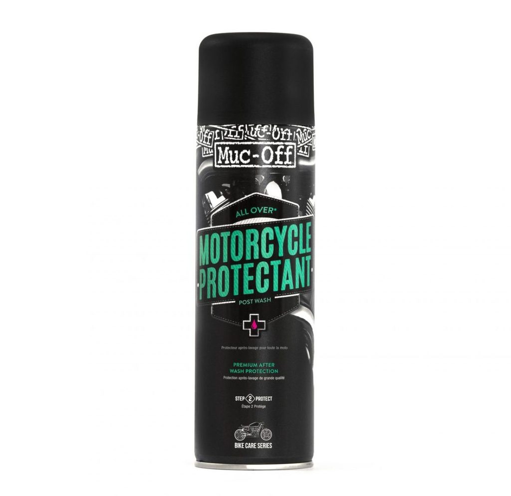 Muc-Off Motorcycle Protectant má jedinečné penetračné vlastnosti, ktoré mu pomáhajú preniknúť aj do ťažko prístupných miest, kde sa môže ľahko udržiavať voda a vďaka svojmu disperznému účinku tak pomáha túto vlhkosť aj z týchto miest vytesňovať. Všetka jeho aplikácia je však najmä prevenciou zachytávaniu nečistôt a ich adhézie do povrchovej štruktúry materiálu v období medzi jednotlivým umývaním.