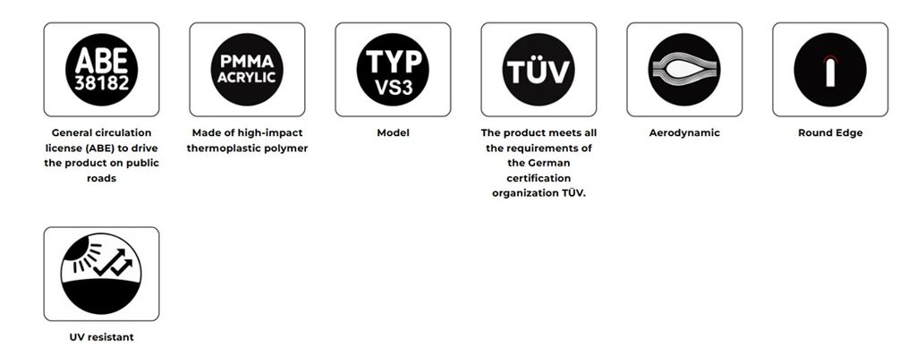 Instalace štítu nevyžaduje žádné další doplňky jako lišty a každý štít je dodáván s podrobnou aerodynamickou studií, která ukazuje zlepšení výkonu a ochranu jezdce.